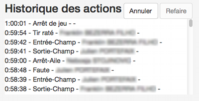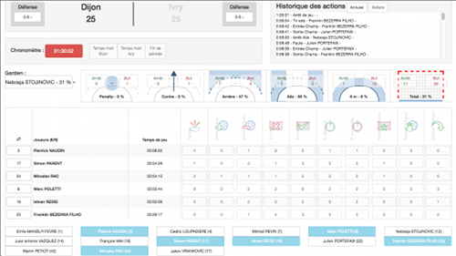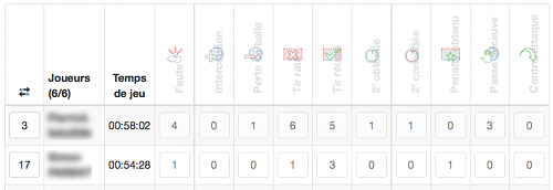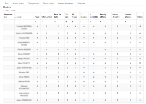 Vous pouvez enregistrer toutes les actions de jeu des joueurs de champs par un simple "clic" sur la case correspondante: faute, interception, perte de balle, tir raté, tir réussi, 2 minutes d'exclusion obtenues, 2 minutes d'exclusion concédées, pénalty obtenu, passe décisive, contre-attaque.