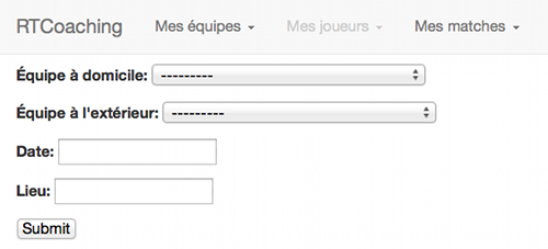 La page d'accueil de l'application permet d'entrer le lieu et la date de la rencontre, les noms des joueurs de votre équipe et de l'équipe adverse.