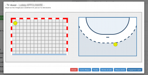 Lorsqu'un tir réussi est enregistré, une nouvelle fenêtre permet de cliquer le point d'entrée dans la cage et le point de tir ainsi que le type de lancé (contre-attaque, pénalty, montée de balle, attaque placée, engagement rapide).