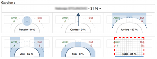 La saisie des actions de jeu du goal se font sur la première partie du tableau: vous y renseignez les buts arrêtés et encaissés ainsi que le zone de tir (pénalty, contre-attaque, arrière, aile, 6 mètres, arrière, contre-attaque, pénalty). Le total s'incrémente et le pourcentage de réussite du goal s'affiche.