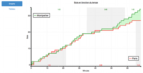 Une synthèse des buts marqués en fonction du temps vous est proposée sous forme de graphique faisant apparaître les systèmes de défense de chaque équipe.